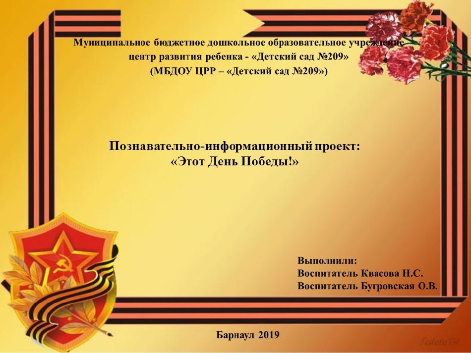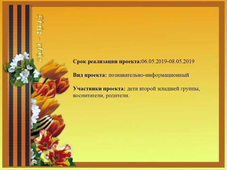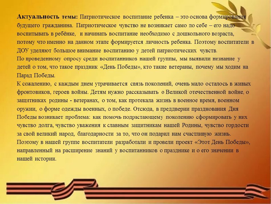 К сожалению, с каждым днем утрачивается связь поколений, очень мало осталось в живых фронтовиков, героев войны. Детям нужно рассказывать о Великой отечественной войне, о защитниках родины — ветеранах, о том, как протекала жизнь в военное время, военном оружии, о форме одежды военных, о победе. Отсюда, в преддверии празднования Дня Победы возникает проблема: как помочь подрастающему поколению сформировать у них чувство долга, чувство уважения к славным защитникам нашей Родины, чувство гордости за свой великий народ, благодарности за то, что он подарил нам счастливую жизнь. Поэтому в нашей группе воспитатели разработали и провели проект «Этот День Победы», направленный на расширение знаний у воспитанников о празднике и о его значении в нашей истории.