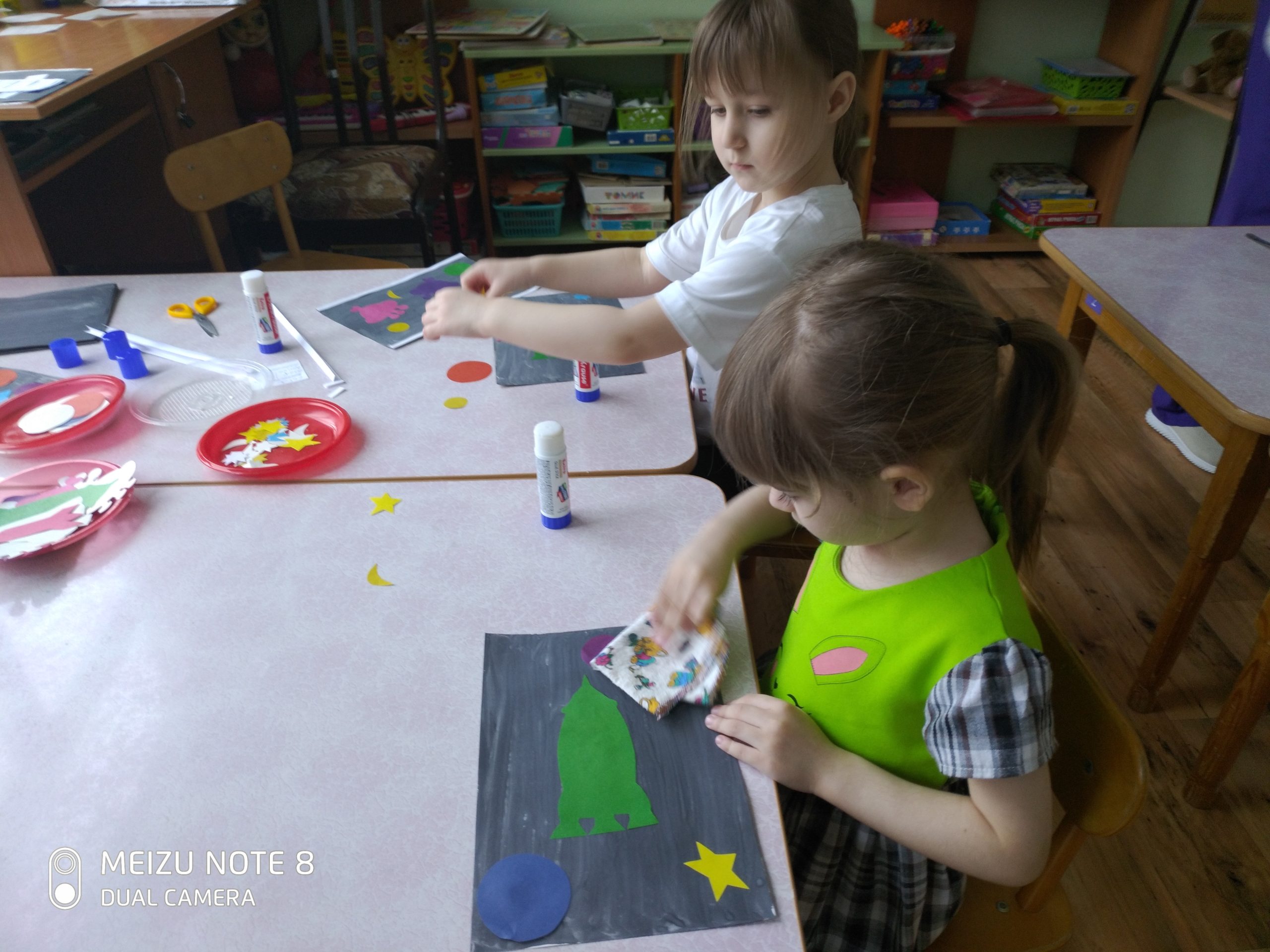 На художественно-эстетическом занятии выполняли аппликацию «Ракета в космосе».