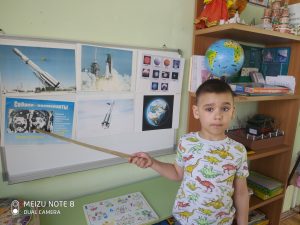 Мы реализовали краткосрочный проект «Этот загадочный космос». Мы с ребятами рассмотрели иллюстрации, картинки, фотографии с изображением звёзд и планет, читали стихи, отгадывали загадки на тему “Космос”. Узнали, кто такие космонавты и на чем они летают в космос. Играя в дидактическую игру «Что возьмем в космос», ребята правильно выбрали, какие костюмы космонавты носят – скафандр. Как зовут первого космонавта – Юрий Гагарин. Воспитанники были удивлены, что не только люди летали в космос, а также собаки Белка и Стрелка. Полученные знания, дети закрепили в своих творческих работах.